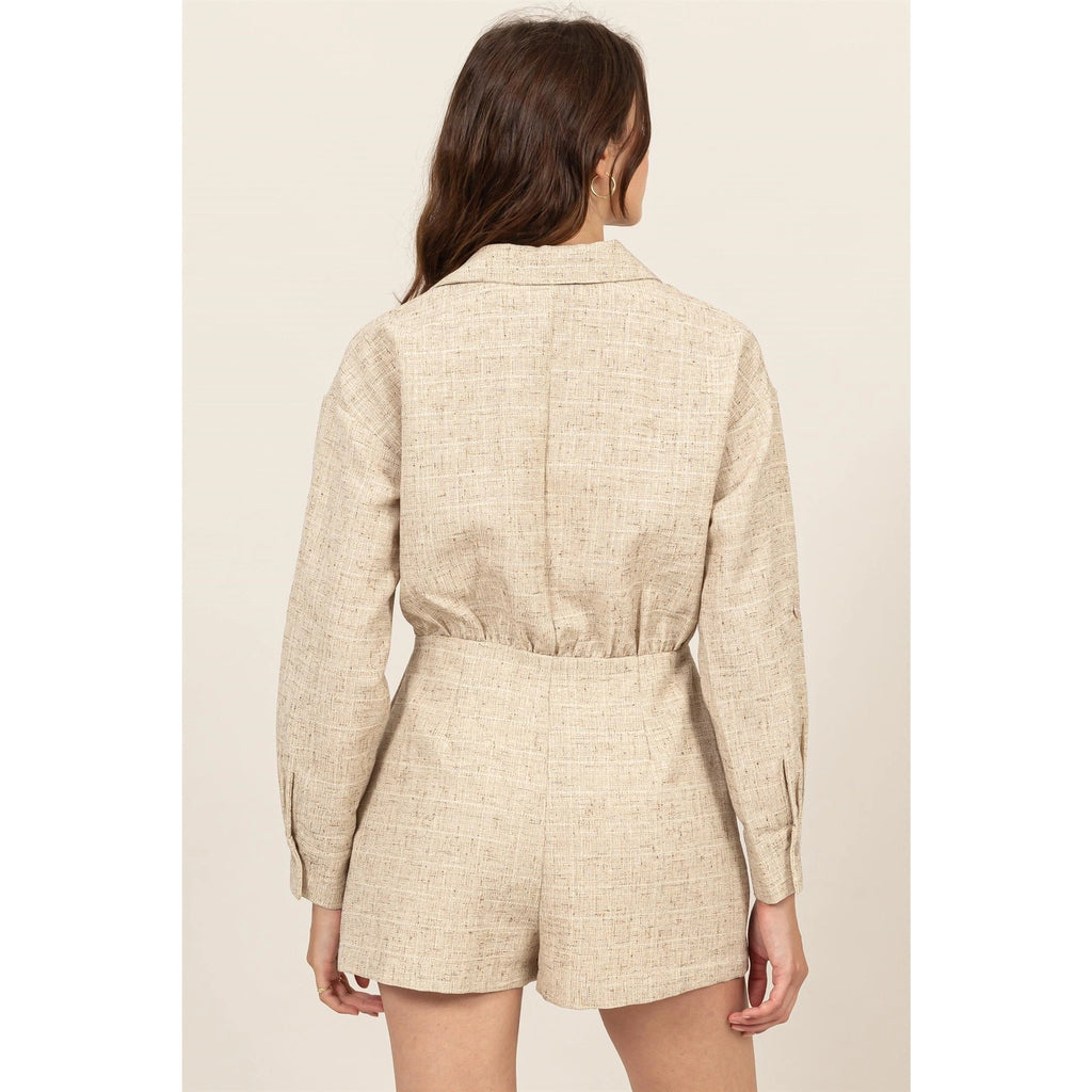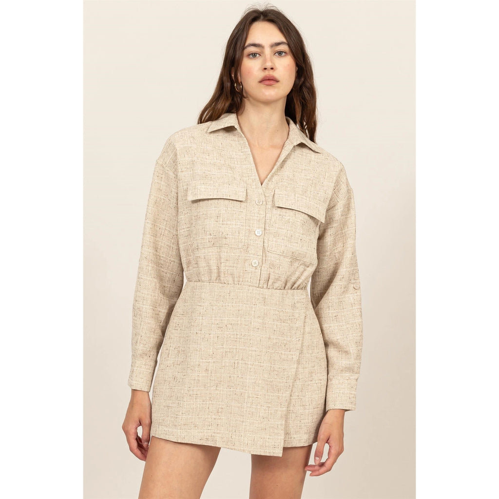 Exude Effortless Style With This Button-Down Mini Romper.Featuring A Collared Neckline And Long Sleeves, This Romper Is Both Elegant And Casual. The Chest Pockets Add A Touch Of Utility, While The Cinched Waist Ensures A Flattering Fit. Made From A Textured Fabric, This Mini Romper Is Perfect For Both Daytime And Evening Occasions. Pair It With Your Favorite Boots Or Sneakers For A Chic, Modern Look. 100% Polyester
